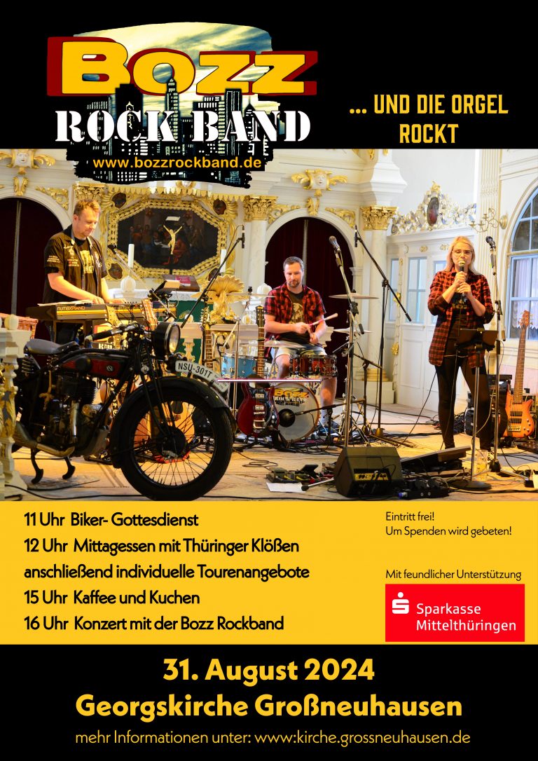 Die Jungs der Bozz Rock Band aus Sömmerda rocken in der klassischen Besetzung: zwei Gitarren, Bass und Schlagzeug. Die Band widmet sich der gitarrenbetonter Folk- und Rockmusik und hat sich in den letzten Jahren vor allem in der deutschen Neil-Young-Fanszene durch ihre Tribute-Interpretationen einen Namen gemacht. Ziel sind jedoch nicht perfekte Cover-Versionen, vielmehr gilt ihr besonderes Augenmerk dem Arrangement eigener Songs. In Großneuhausen wird das Repertoire bei einigen Titeln durch die Orgel ergänzt. So entsteht ein ganz besonderes und äußerst seltenes Hörerlebnis.